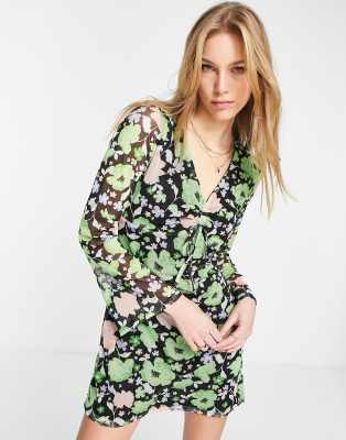 River Island Floral 70s Mesh Flared Sleeve Mini Dress In Green ModeSens